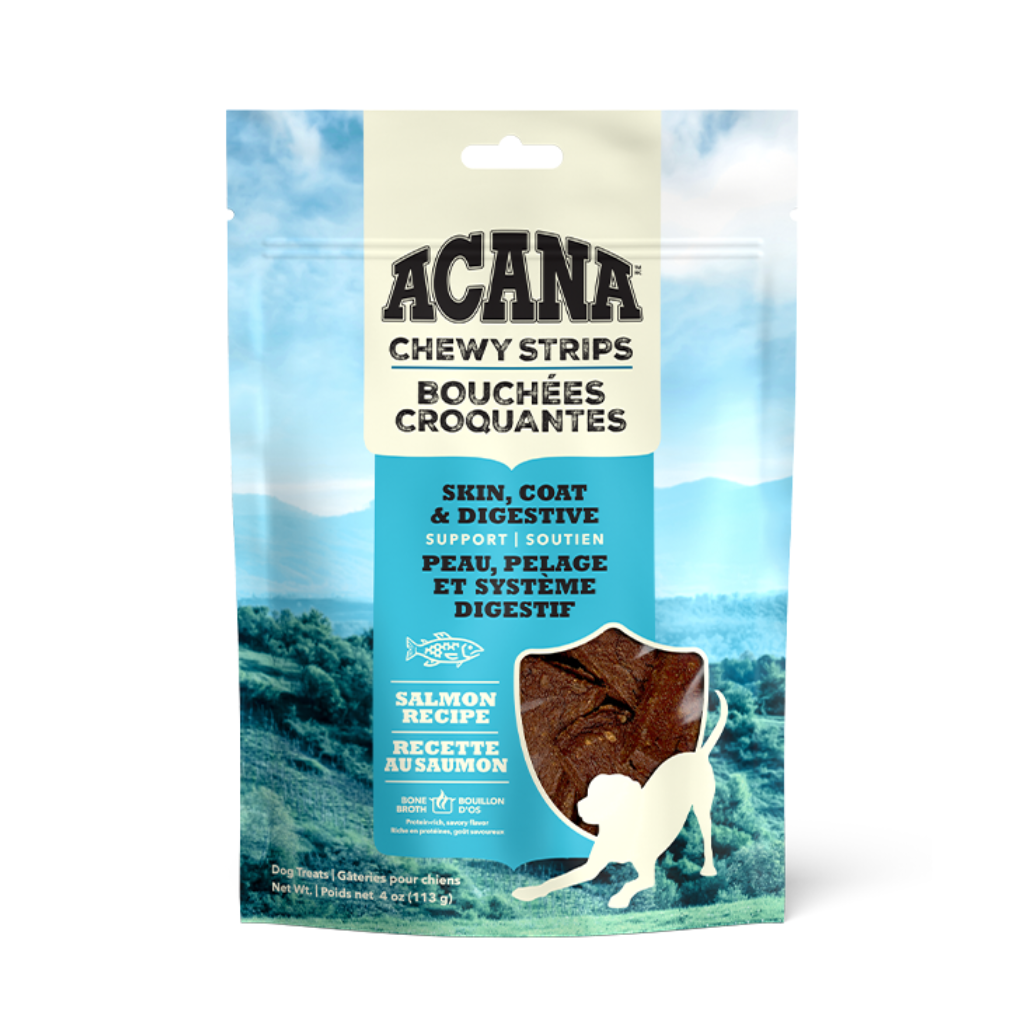 ACANA™ Chewy Strips feature wild-caught salmon and pumpkin for skin, coat, and digestive support. Made with 85% animal ingredients*, Omega-3s, and fiber, they’re packed with protein and flavor from bone broth and honey. Free of artificial preservatives, these USA-made treats are perfect for rewarding your pup while promoting their wellbeing!