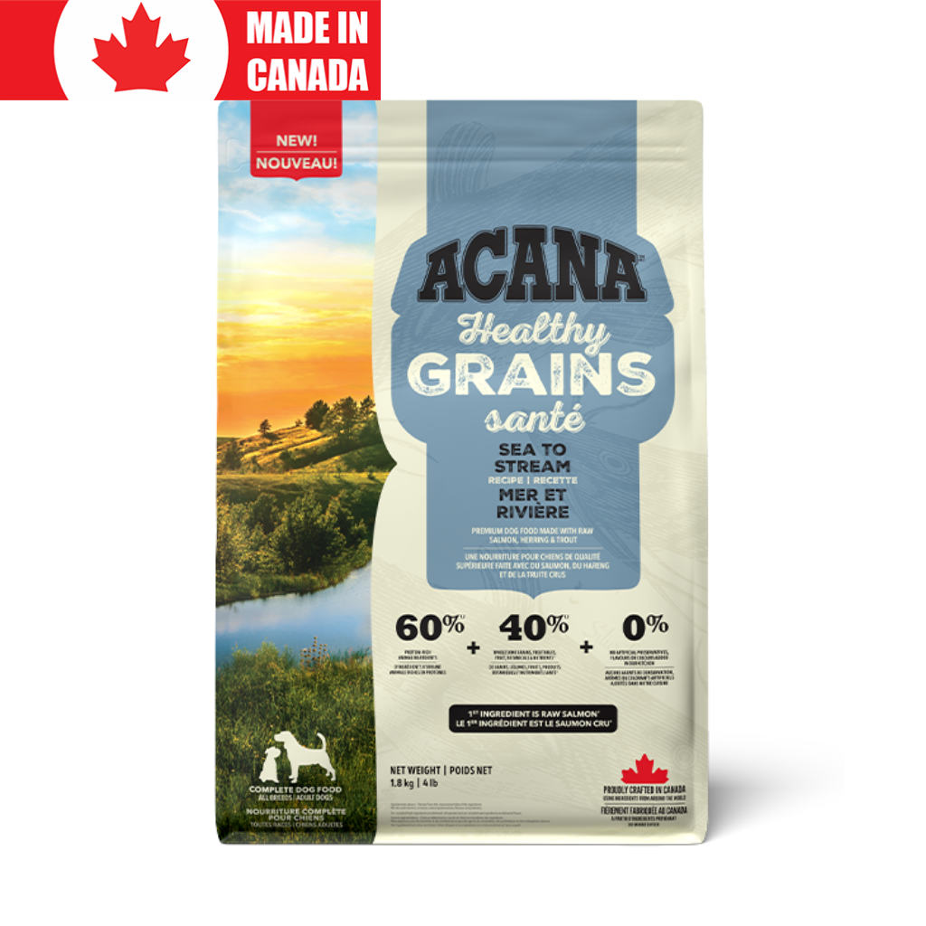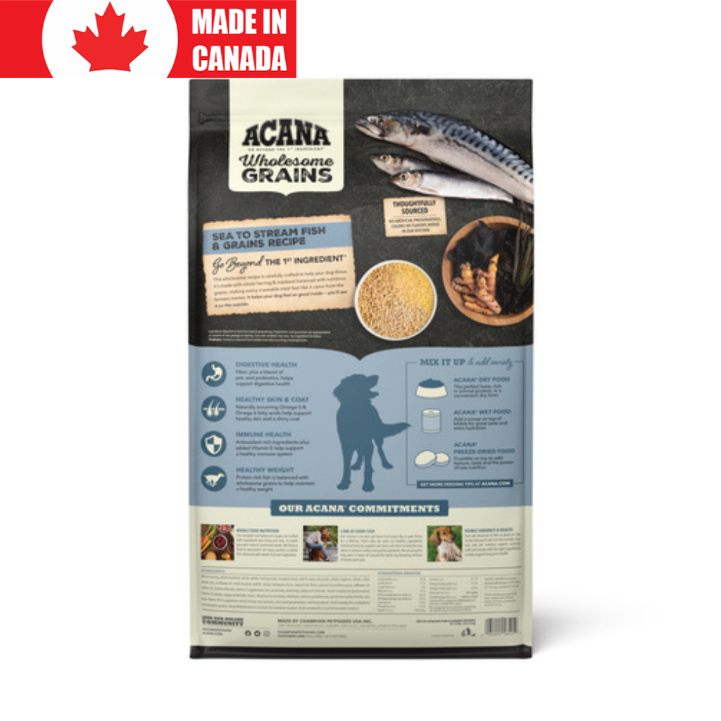 ACANA™ Wholesome Grains Sea to Stream Recipe features whole raw herring, mackerel, and catfish balanced with oats, sorghum, and millet for healthy weight management. With 70% animal ingredients and 30% grains, it includes antioxidants to support immune health, providing your dog with the nutrition they need for a happy, healthy life.