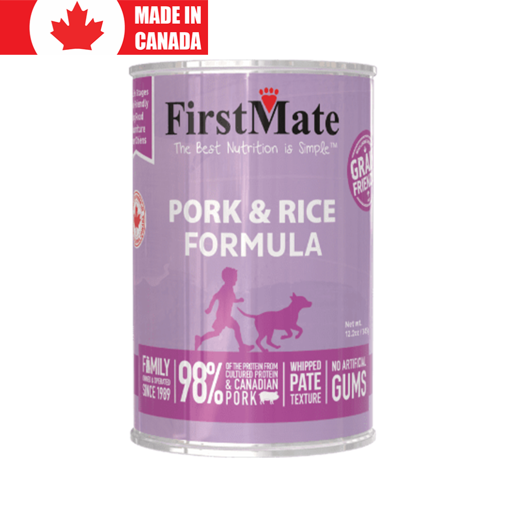 FirstMate's Grain Friendly™ Pork & Rice formula features Canadian, food-grade pork without added hormones and quality rice. This formula is perfect for everyday feeding and can be served alone as a complete and balanced meal or paired with FirstMate dry options.