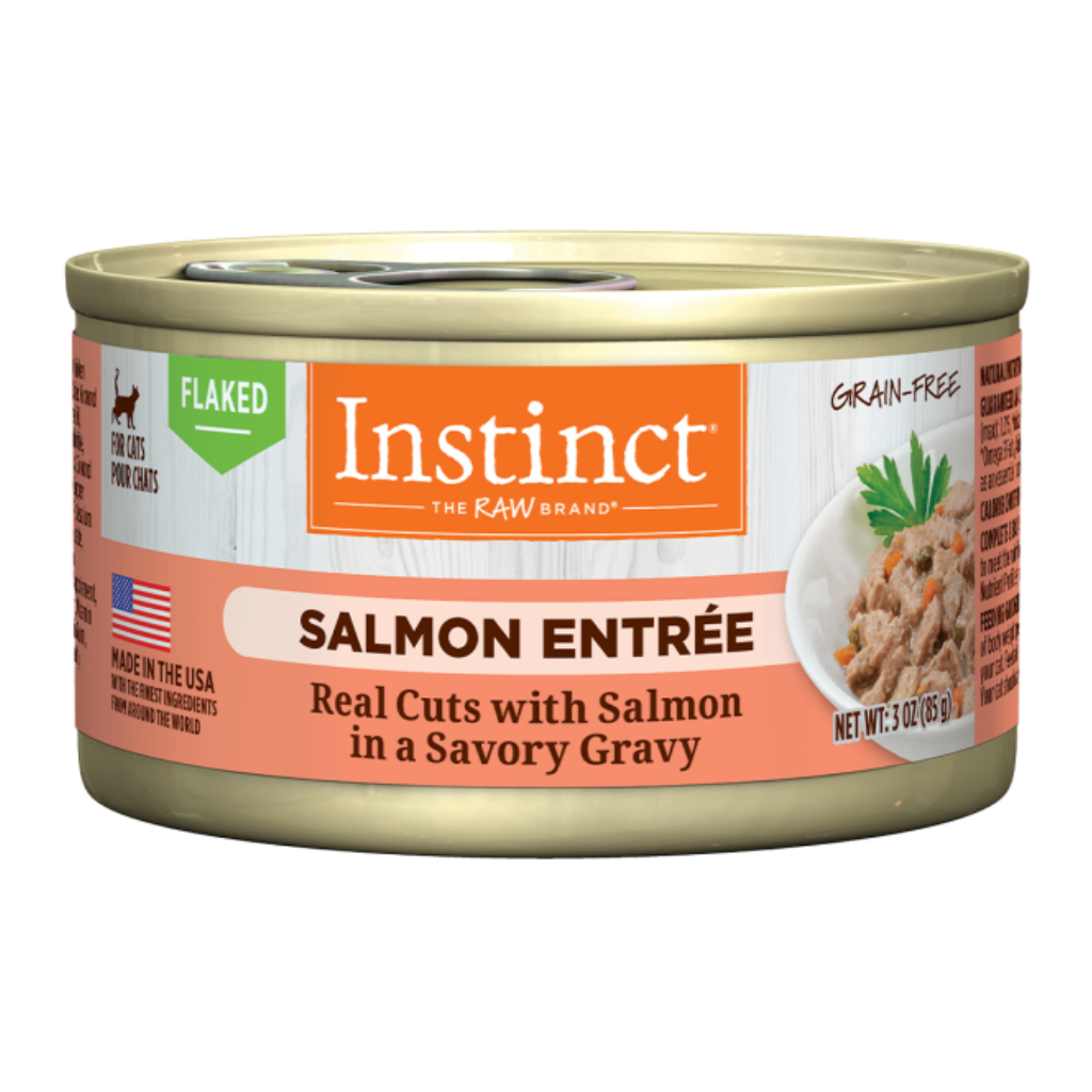 Instinct Salmon Entrée Flaked Cat Food is made with flaked cuts of salmon in a savory gravy, and with whole-food ingredients you can see, like carrots and spinach. Each ingredient is carefully chosen for their nutritional value and digestibility. Made in the USA, this food is made without grain, potato, corn, wheat, soy, carrageenan, gluten, artificial colors or preservatives.